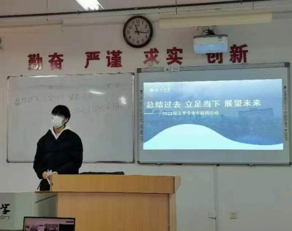为认真贯彻落实习近平总书记在二十大报告中关于教育的重要论述,进一步加强同学们的时间观念,帮助树立更正确的人生观以及进一步增进同学情谊,增强集体荣誉感与归属感,我院2022级法学专业本科一班学生于2024年1月8日下午,开展了“总结过去、立足当下,展望未来”主题实践周系列活动。本次实践周活动围绕主题,以座谈、交流和观影相结合的方式予以展开,分别以“总结过去”“立足当下”“展望未来”为三条线索,将内容分为三部分,涵盖学业成绩、专业技能、实践经验、荣誉奖项、思想觉悟、兴趣爱好、集体活动等多方面内容,加大反思总结的力度、加强经验分享的综合性、提升未来规划的精准性和精确性。具体而言,以观看影片《风雨哈佛路》为切入,激发同学们考取大学时的热情,同时激发他们在学习生活中不惧艰难的斗志。影片之后,由班委带头、各位同学依次进行发言交流。