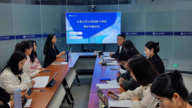 同一时间,研究生汇报第三场于西学楼1006会议室举办,研会邀请了经济法学教研部赵海怡老师进行评议。十位研究生就当下的前沿经济法学问题和社会热点案件,进行了深入的分析和探讨,赵海怡老师除了对同学们论文中的存在的问题进行指点和纠正之外,也参与到讨论之中,给同学们提供了具有指导意义和理论深度的学术思考。