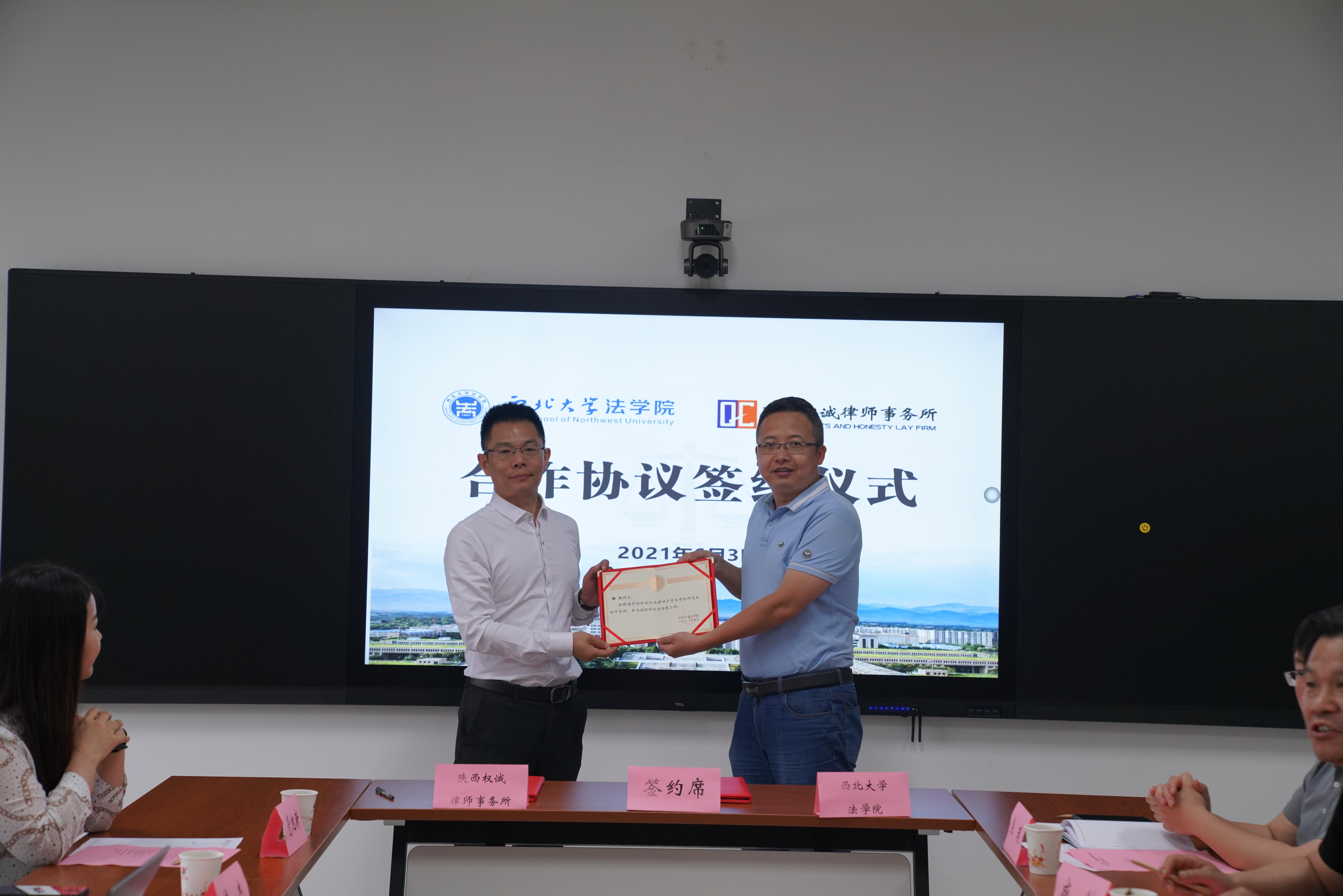 王思锋院长与李丹主任代表双方单位签署了合作协议。学院环境与资源保护法学教研部主任王社坤教授和陕西权诚律师事务所副主任张宝刚律师共同为实践教学基地揭牌。学院副院长代水平向陕西权诚律师事务所主任李丹、副主任张宝刚和高级合伙人梅杰颁发了法律硕士实务导师聘书。梅杰律师代表法律硕士实务导师作了发言,表示未来一定按照学院的要求,参与服务于学院研究生培养工作。