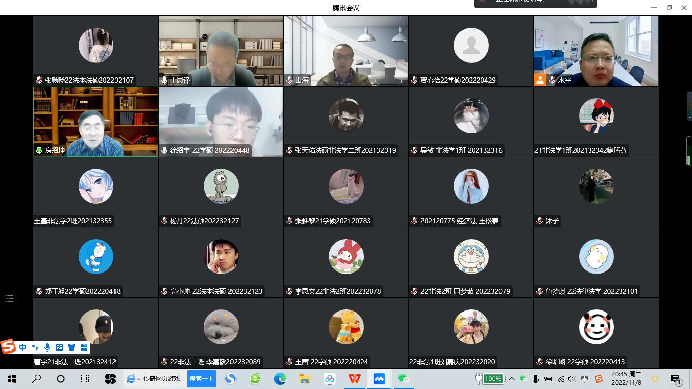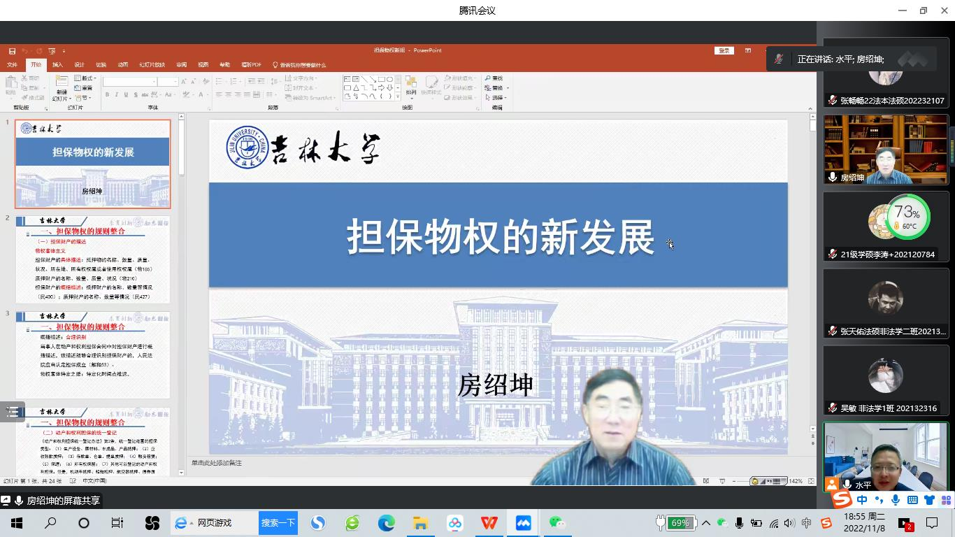2022年11月8日晚,吉林大学卓越教授,博士生导师,国家级教学名师、新世纪百千万人才工程国家级人选、中宣部“四个一批”人才,教育部高等学校法学类专业教学指导委员会副主任委员,享受国务院政府特殊津贴,原烟台大学校长房绍坤教授做客我校“侯外庐学术讲座”,为学院师生作了题为“担保物权制度的新发展”的学术讲座。讲座由学院院长王思锋教授主持,代水平副院长、张曼副教授、彭秀坤副教授,李奕霏副教授、田海副教授、涂慧副教授、杜路副教授、傅强博士以及2021级、2022级硕士研究生220余人参加了此次讲座。